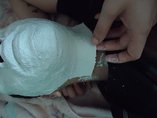 My mask is a dead set against self-portrait of my morals, my personality, and my appearance. I created an anti-ray mask essentially. Most of my artwork doesn’t have such a negative or dark element to it. I wanted to show that the opposite of me has two very depressing personas or faces. One face looks like my own but very gory and very textured. It has one eye cover up with gauze bandage, symbolizing the neglect to be open minded, and the other is glowing which is not allowing you to see directly into the eyes of the real person or the person behind the mask, symbolizing the inability of ignorance to see through or past their cynical judgments. The mouth is sown shut symbolizing how evil thought are often kept inside and shut away until one day when they are released in a self defeating fashion. The second face is shown peeling away from the first face with great emotional distress. The face is another personality that I am not. It symbolizes a sort of completely submissive running solely on emotion, pathetic being who I never want to become. The two faces are sort of Remorse and satisfaction of ignorance juxtaposed.